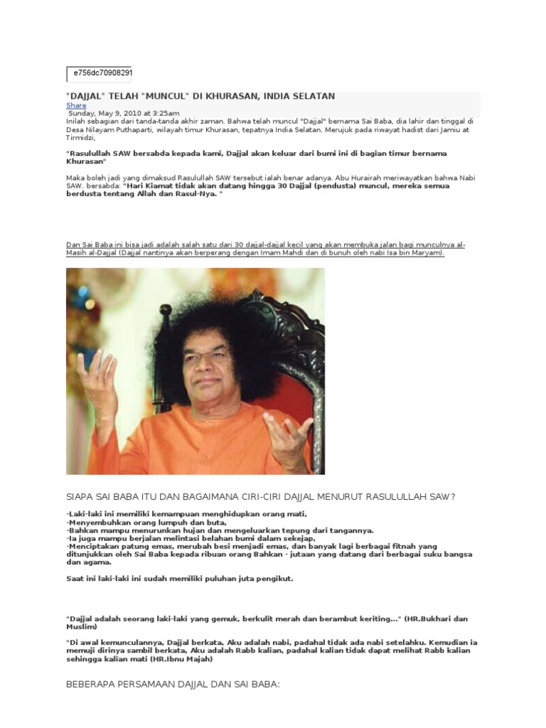 Sai Baba Dajjal Kecil Dajjal Pendusta Posted. Sai Baba mengklaim bahwa dirinya adalah Tuhan penguasa alam semesta. Sai Baba Antek Dajjal Itu Mati.